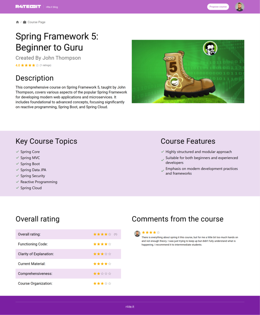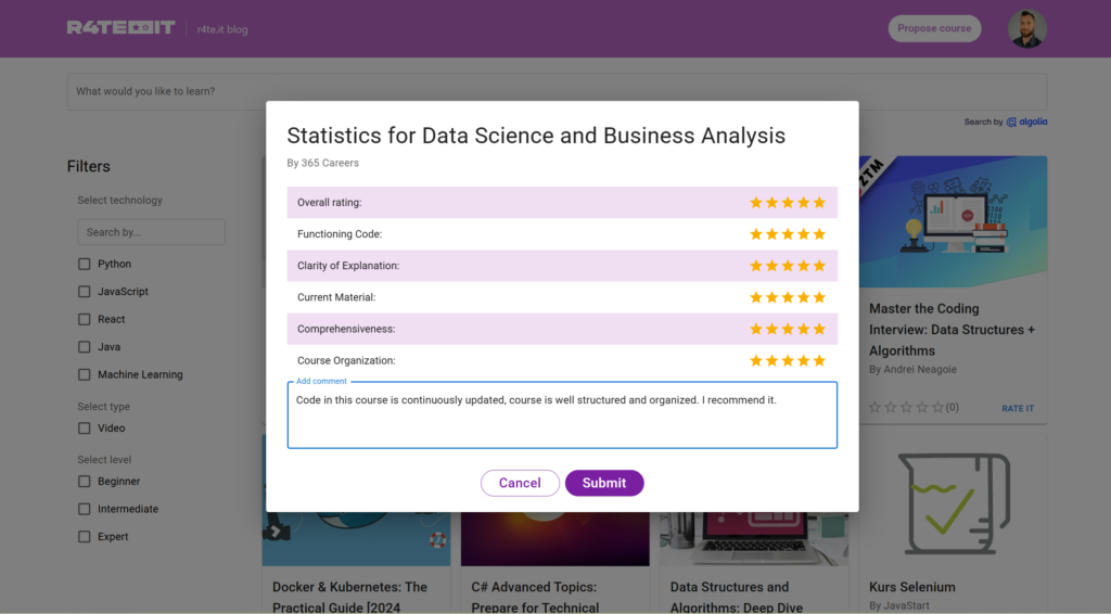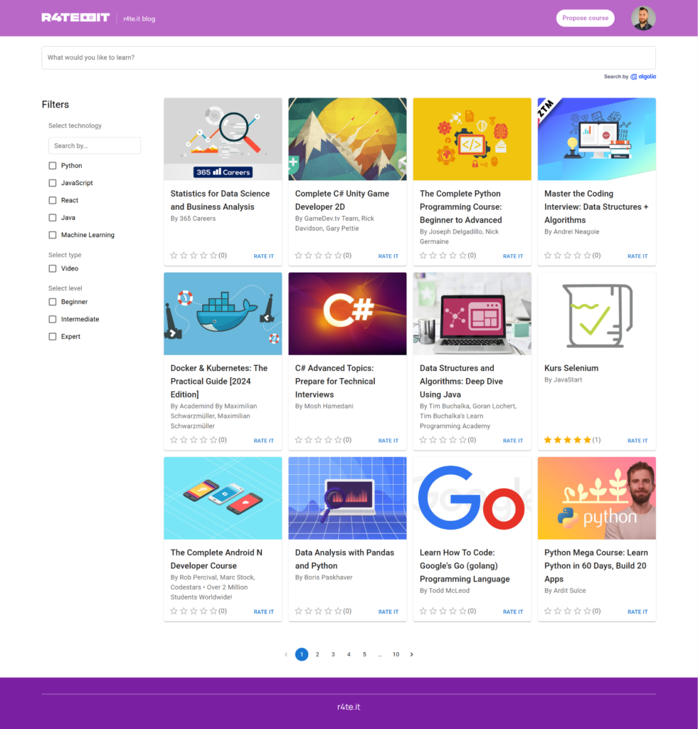 - If you want to rate the course that is not on the website, you can firstly propose it by clicking Propose course in the right top corner.